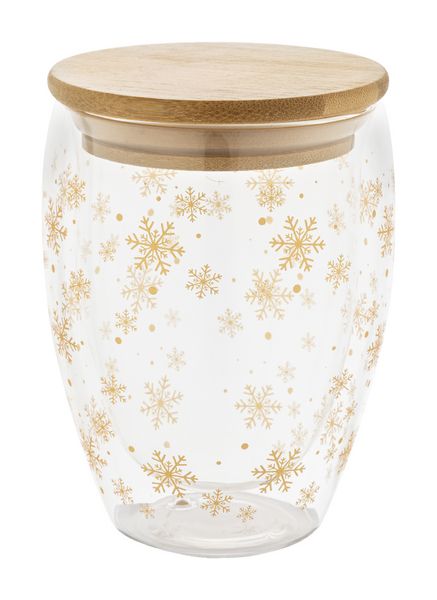 Werbeartikel Weihnachts-Thermobecher Glas Bostro. Doppelwandiger Thermobecher aus Borosilikatglas mit weihnachtlichem Schneeflockendesign und Bambusdeckel. Füllmenge: 310 ml. Einzeln in Kraftpapierbox.