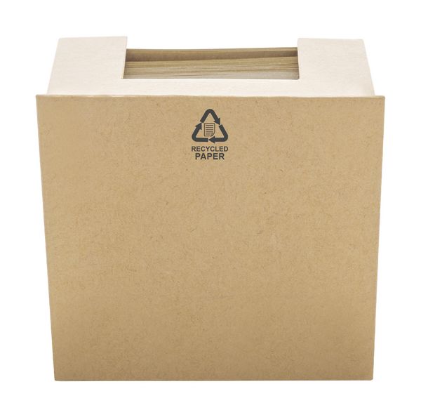 Werbeartikel Haftnotizspender Haus Hutnot. Hausförmiger Notizspender aus recycelter Pappe mit 300 Blatt Memo-Block aus recyceltem Kraftpapier. Oben mit 25 gelben Haftnotizen und 100 Seitenmarkierungen in 4 Farben. - 100% EU Druckproduktion. Gerne senden wir Ihnen auf Wunsch ein Muster des Werbeartikels.
