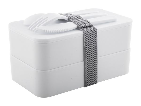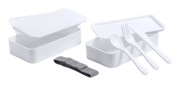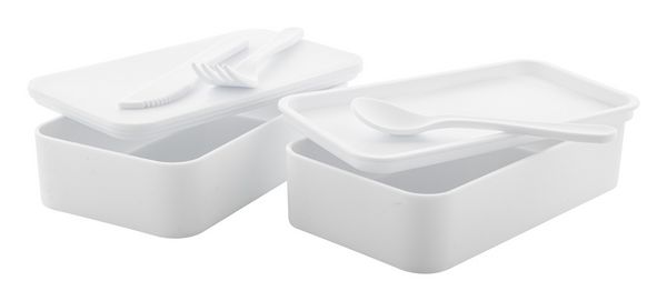 Werbeartikel Antibakterielle Lunchbox Ayam. Lunchbox aus antibakteriellem Kunststoff mit Besteckset (Gabel, Löffel und Messer) und elastischem Band. Mit 2 Fächern mit je 700 ml Fassungsvermögen. ISO 22196-konform. - 100% EU Druckproduktion. Gerne senden wir Ihnen auf Wunsch ein Muster des Werbeartikels.