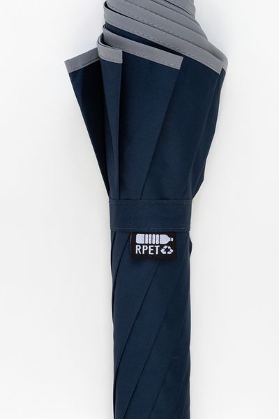 Werbeartikel Recycling-Regenschirm Thunder Max. Automatischer Windproof-Regenschirm mit 8 Segmenten und reflektierender Zierleiste. Material: Metallrahmen, Fiberglasspeichen, EVA-Griff und Bespannung aus190T RPET-Pongee. Mit RPET-Label. Nur für Werbezwecke, nicht als persönliche Schutzausrüstung geeignet. - 100% EU Druckproduktion. Gerne senden wir Ihnen auf Wunsch ein Muster des Werbeartikels.