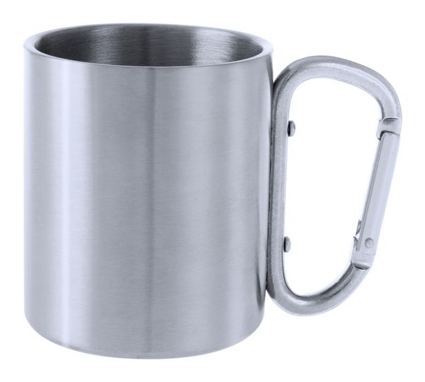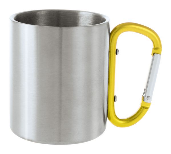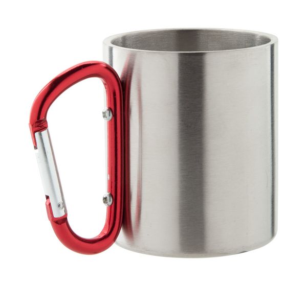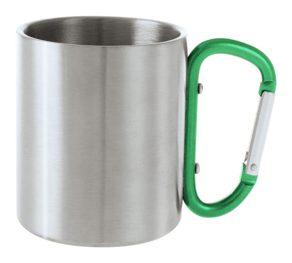 Werbeartikel Edelstahlbecher Cadisha. Edelstahlbecher mit farbigem Karabinergriff. Füllmenge: 200 ml. - 100% EU Druckproduktion. Gerne senden wir Ihnen auf Wunsch ein Muster des Werbeartikels.