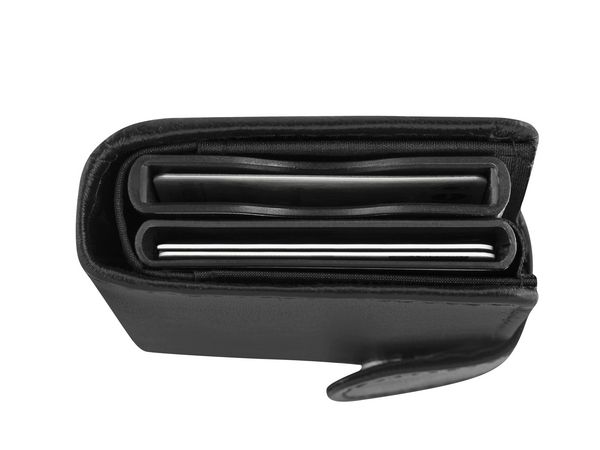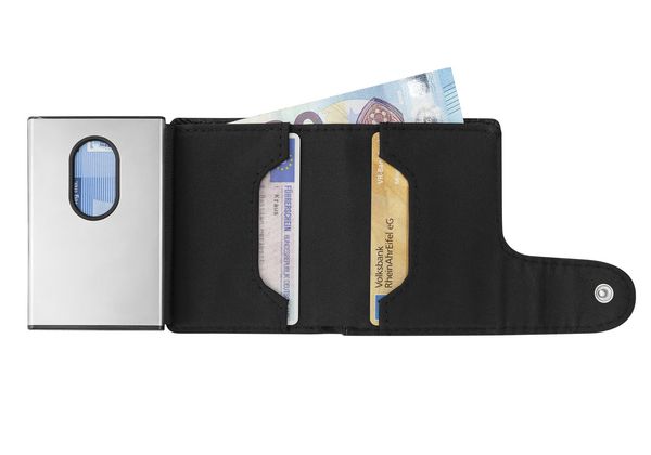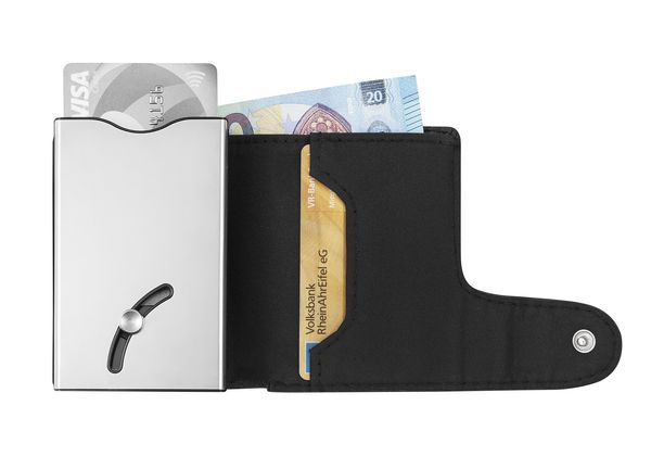 Werbeartikel Geldbörse IWalletDeLuxeDuo. Die edle Leder-Geldbörse mit 2 EasySlideOut Aluminiumetuis und vielen Fächern definiert den neuen Standard kompakter, funktioneller Börsen. RFID geschützt, VPE 100. Münz- und Scheinfach, Kredit- und Visitenkartenfächer