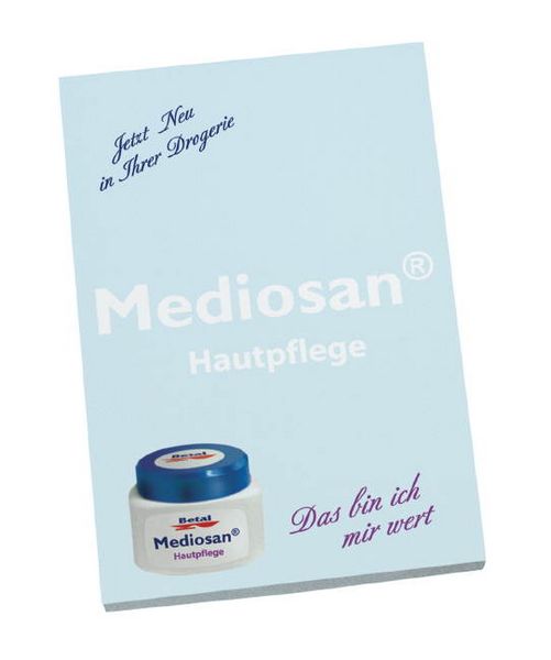 Das Werbegeschenk Haftnotizen 50x72/100 Blatt können Sie ab 250 Stk. mit Ihrem individuellen Logo oder Motiv gestalten (4C Digitaldruck) und ist ideal als Werbemittel einsetzbar. Den Werbeartikel liefern wir inkl. Werbeanbringung in ca. 3-4 Wochen - Express-Lieferzeit auf Anfrage.