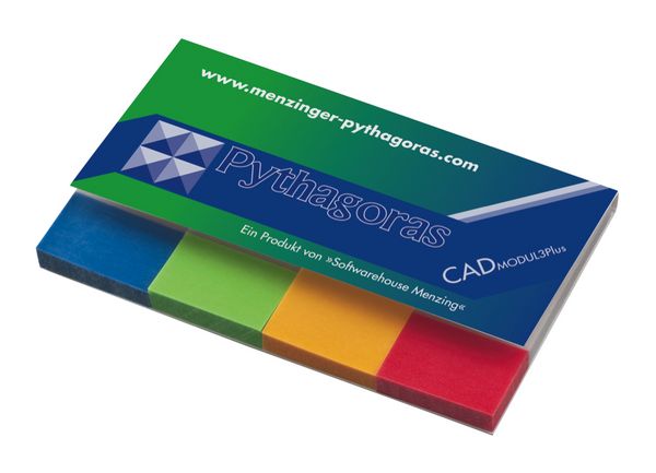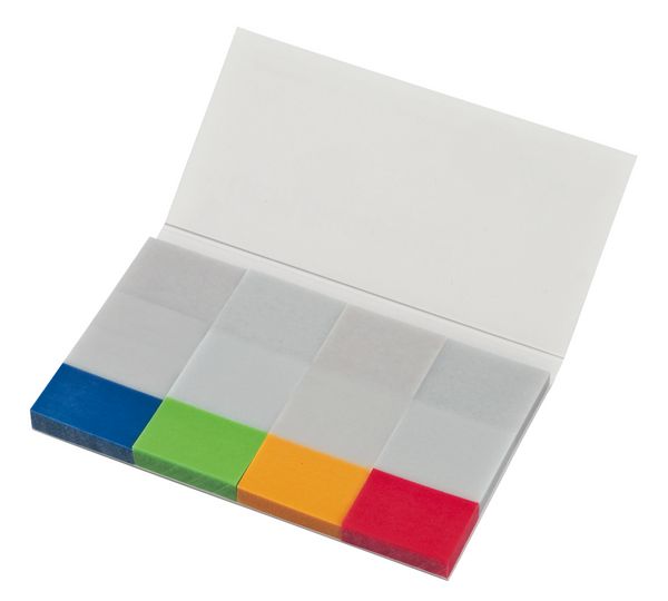Werbeartikel Marker transparent im Kartonumschlag. Filmmarker-Set im Kartonumschlag mit 4 transparenten Klebestreifen je 40 Stück. Die Marker aus Transparentpapier sind am Ende in 4 verschiedenen Farben (rot, blau, gelb, rot) eingefärbt. Der Umschlag kann außen in 4/0 Skala bedruckt werden, und wird dann mit UV-Lack überzogen. Hochwertige Markenqualität - Made in Germany!