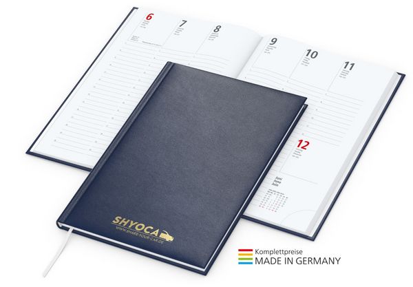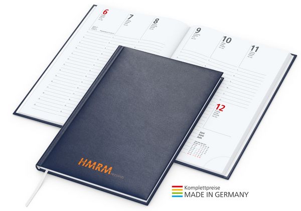 Werbeartikel Buchkalender Wochentimer Prestige. Wochentimer im A5-Format mit 128 Seiten im robusten Kunstleder-Einband. 3sprachiges Kalendarium mit einer Woche je Doppelseite und Stundeneinteilung von 7 bis 20 Uhr. Verarbeitung: Hardcover mit wattierter Buchdecke, Eckenperforation, Lesezeichen, Kapitalband, runder Rücken. Einband Balacron (robustes Kunstleder). Zahlreiche andere Einbandmaterialien auf Anfrage verfügbar!
