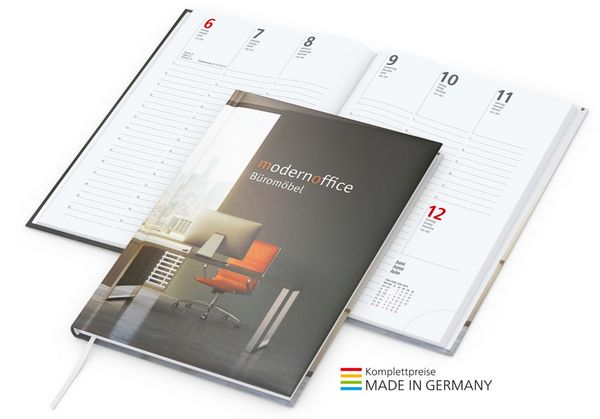 Das Werbegeschenk Buchkalender Wochentimer Prestige können Sie ab Stk. mit Ihrem individuellen Logo oder Motiv gestalten (Bedrucken, Prägen, 4C Digitaldruck) und ist ideal als Werbemittel einsetzbar. Den Werbeartikel liefern wir inkl. Werbeanbringung in ca. 4-5 Wochen - Express-Lieferzeit auf Anfrage.