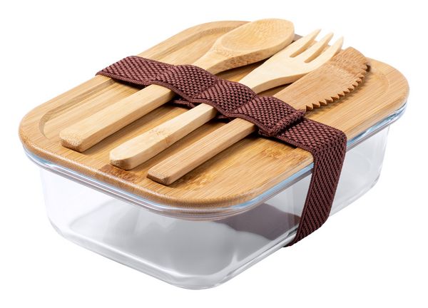 Werbeartikel Glas Jausenbox Bejar. Lunchbox aus Glas mit Deckel aus natürlichem Bambus mit Besteckset aus Bambus (Gabel, Messer und Löffel) und Elastikband. Füllmenge: 500 ml. Gerne senden wir Ihnen auf Wunsch ein Muster dieses Werbeartikels.