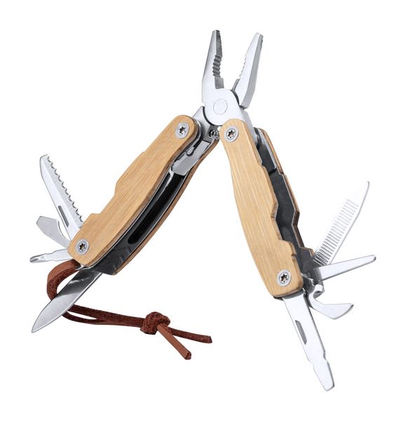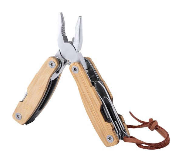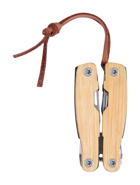 Werbeartikel Multitool Hakim. Multitool aus Edelstahl mit Bambusgriff und 12 Funktionen. Mit Band aus Kunstleder. - 100% EU Druckproduktion. Gerne senden wir Ihnen auf Wunsch ein Muster des Werbeartikels.