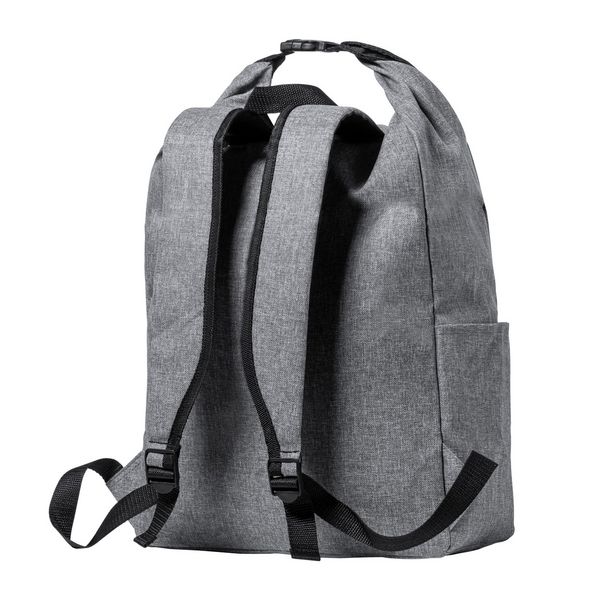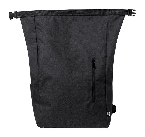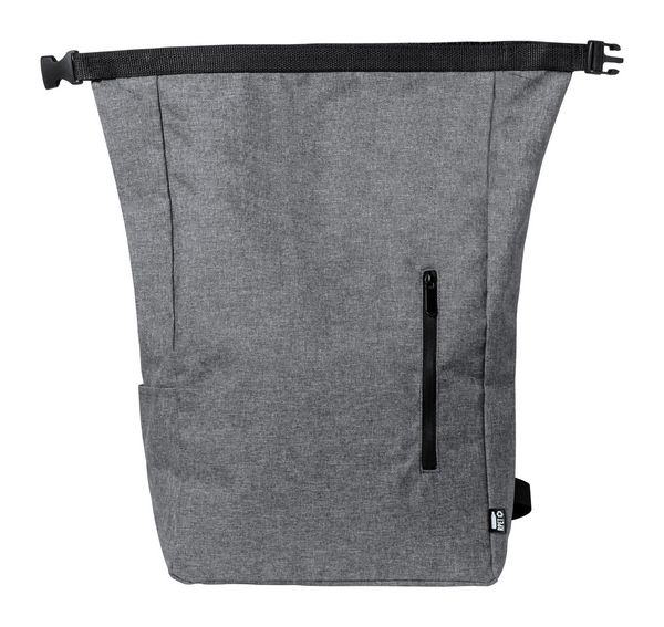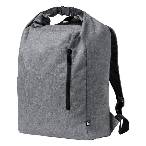 Werbeartikel RPET Rucksack Sherpak. Wasserfester Rolltop-Rucksack aus RPET mit Seitentasche, Reißverschluss-Vorderfach und ergonomischen Rücken und Schultergurten. Material: 300D RPET Polyester, mit abtrennbarem RPET-Label.