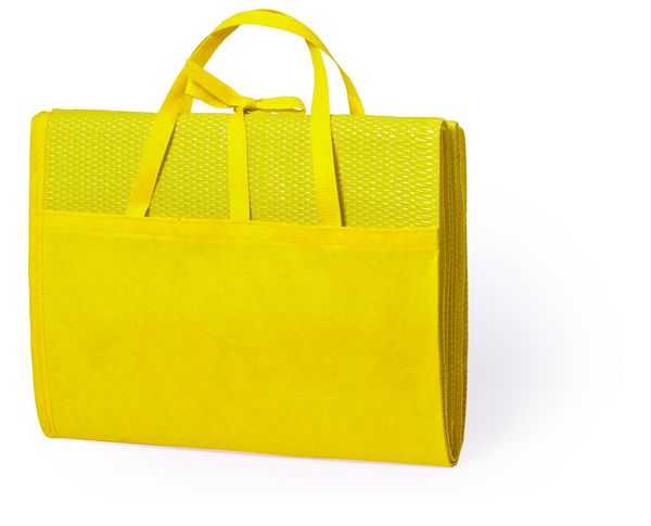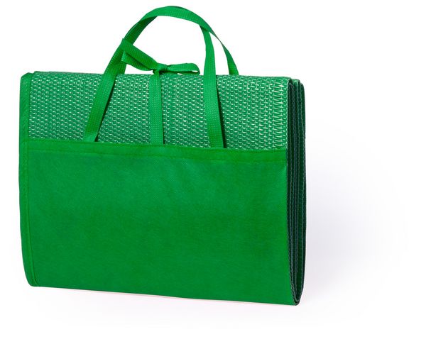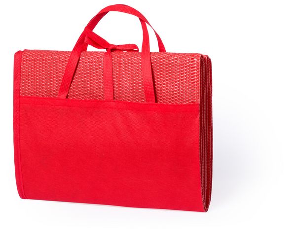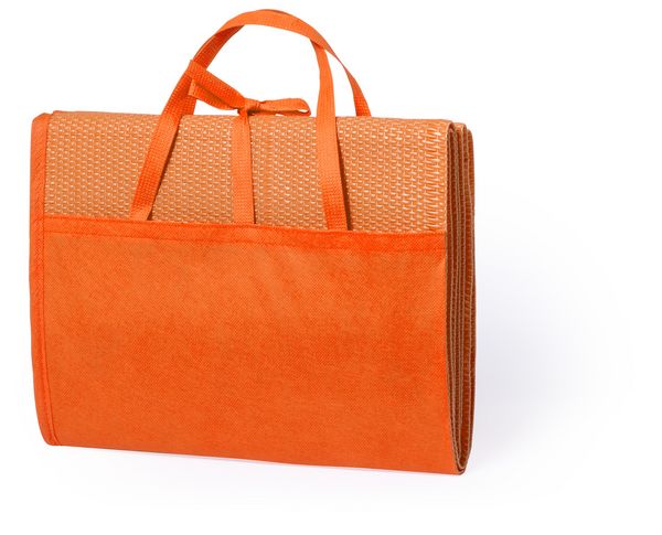 Werbeartikel Strandmatte Kassia. Geflochtene Strandmatte aus Kunststoff mit Tragefriffen.