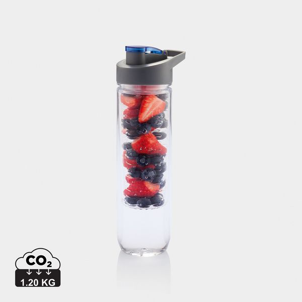Werbeartikel Wasserflasche mit Aromafach. 800ml Tritan Flasche mit Früchte Aromafach. Bereichern Sie Ihr Wasser mit Vitaminen und einer Menge Geschmack durch das einfache Hinzufügen von frischen Früchten im Aromafach. Dieses Fach kann durch das Beimengen von Eiswürfeln auch als Kühlfach verwendet werden.