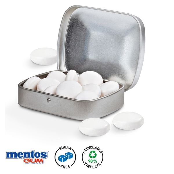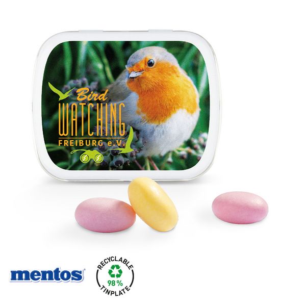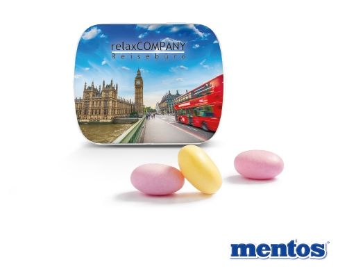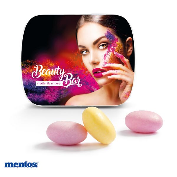 Werbeartikel Pfefferminz Starmint-Box Mentos. Scharnierdeckeldose mit gewölbtem Deckel, weiß, matt-silber oder blank aus Metall mit verschiedenen Füllvarianten, klimaneutral, individuell bedruckt. Mit Originalitätsverschluss und Aufreißperforation. Weißblech 98% recycelbar. Inhalt: Mentos Kaudragee in der Geschmacksrichtung Mint oder Fruit (Erdbeere, Orange, Zitrone - gemischt), 25 g. Haltbarkeit: 12 Monate.